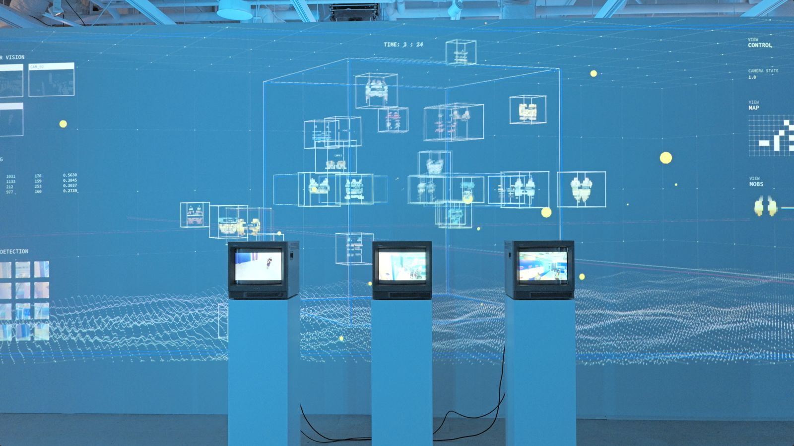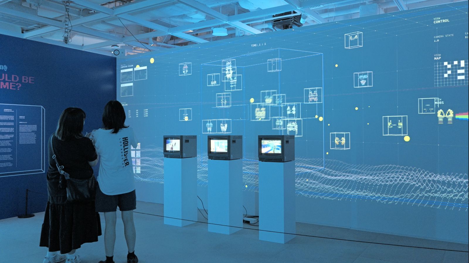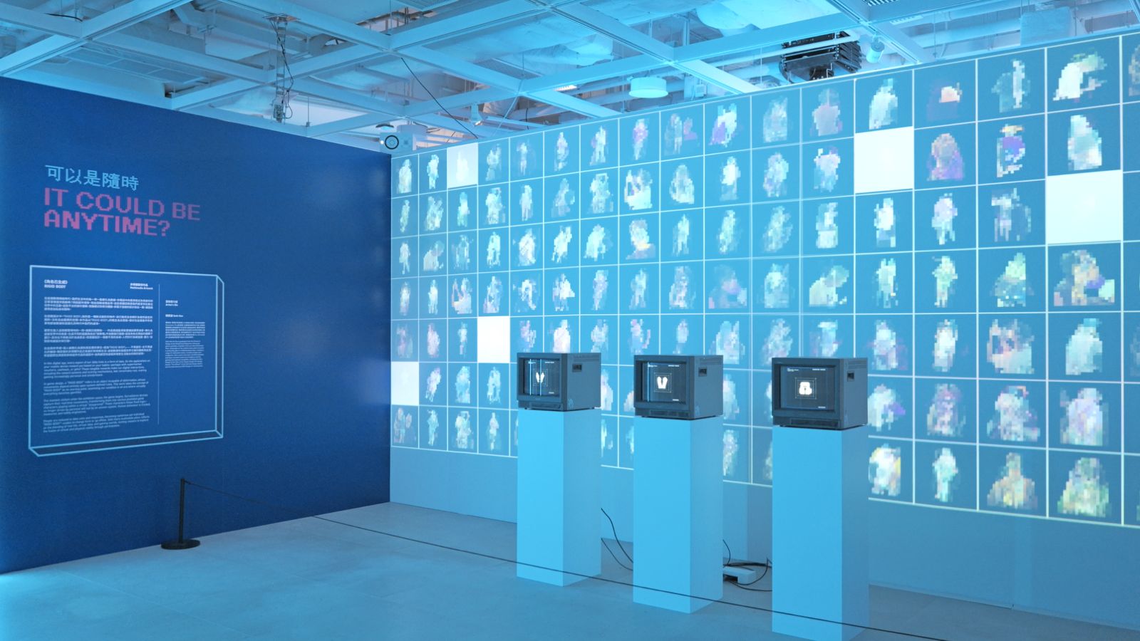 觀眾的身影被監視裝置即時捕捉,轉化為虛擬世界中的像素。這些角色在一套預設邏輯下活動,其存在方式已不再取決於自身意志,而是服從於一個看不見的系統。