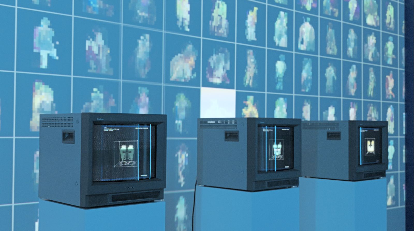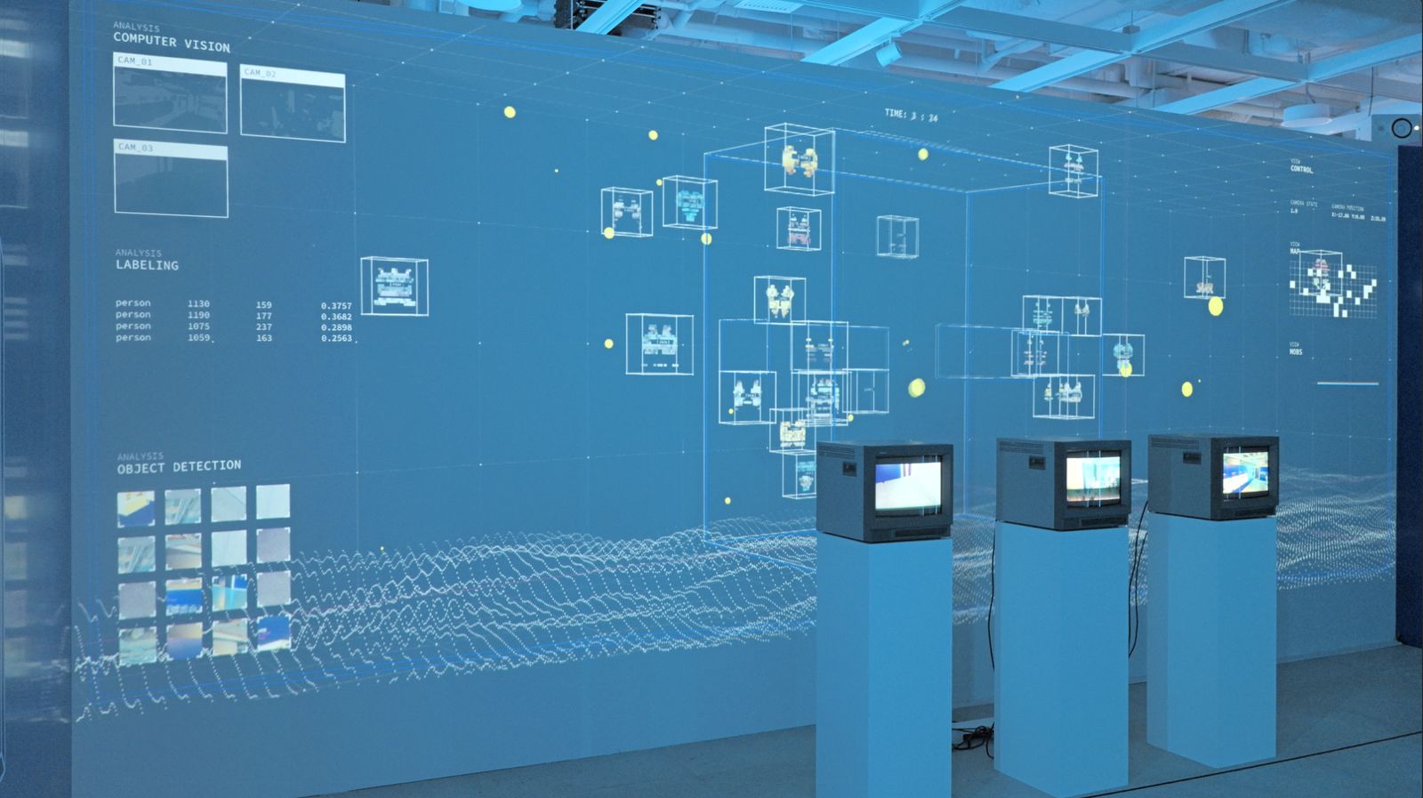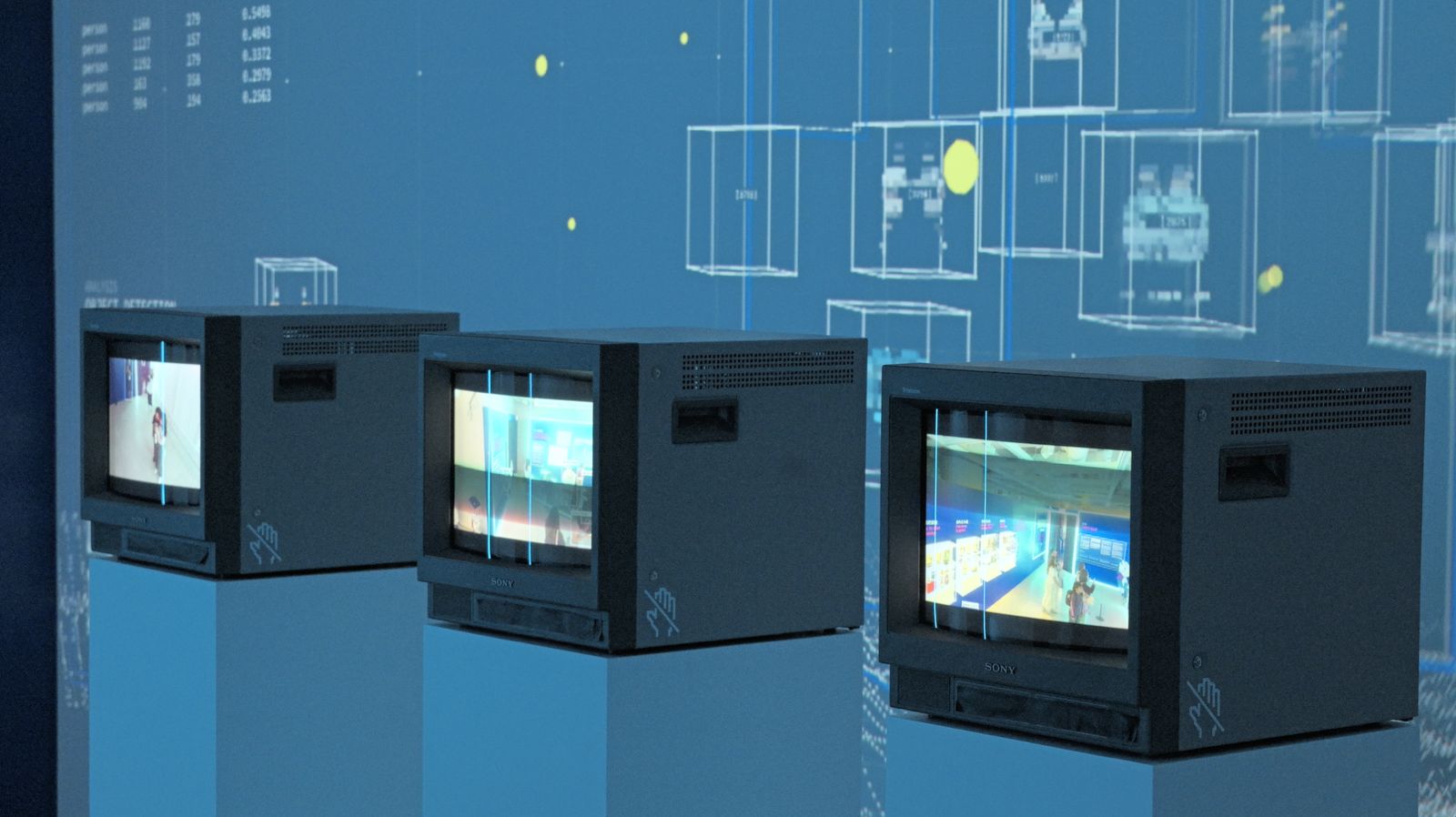 觀眾的身影被監視裝置即時捕捉,轉化為虛擬世界中的像素。這些角色在一套預設邏輯下活動,其存在方式已不再取決於自身意志,而是服從於一個看不見的系統。