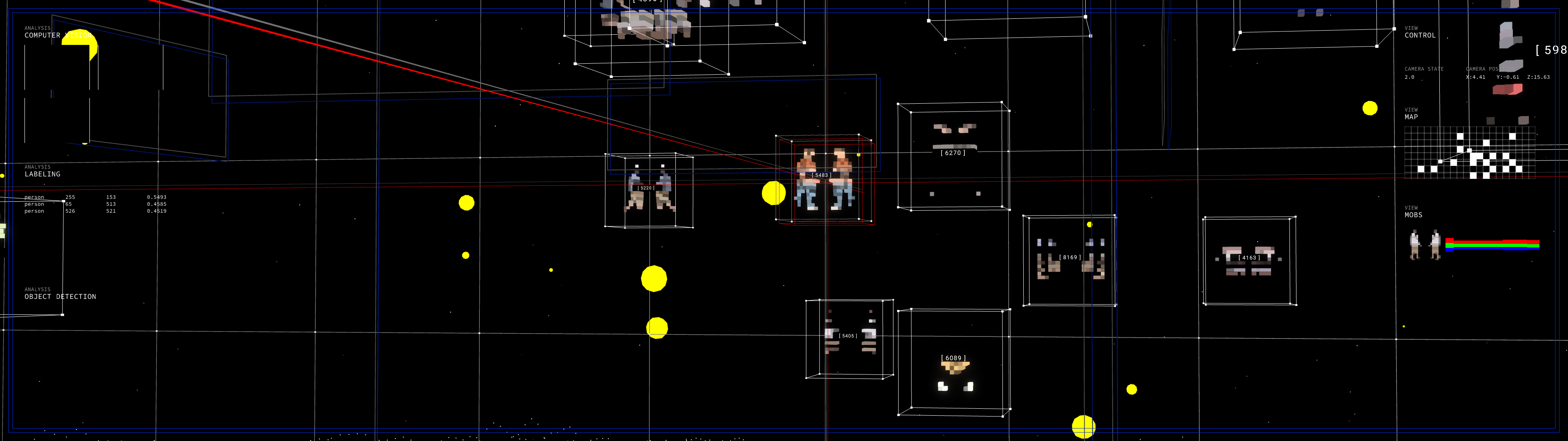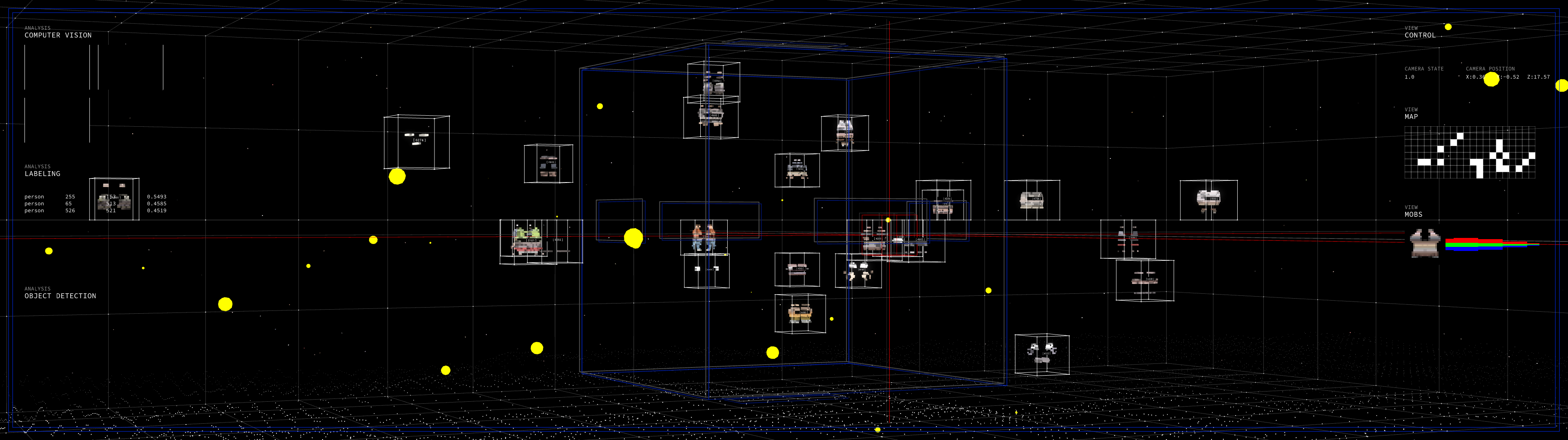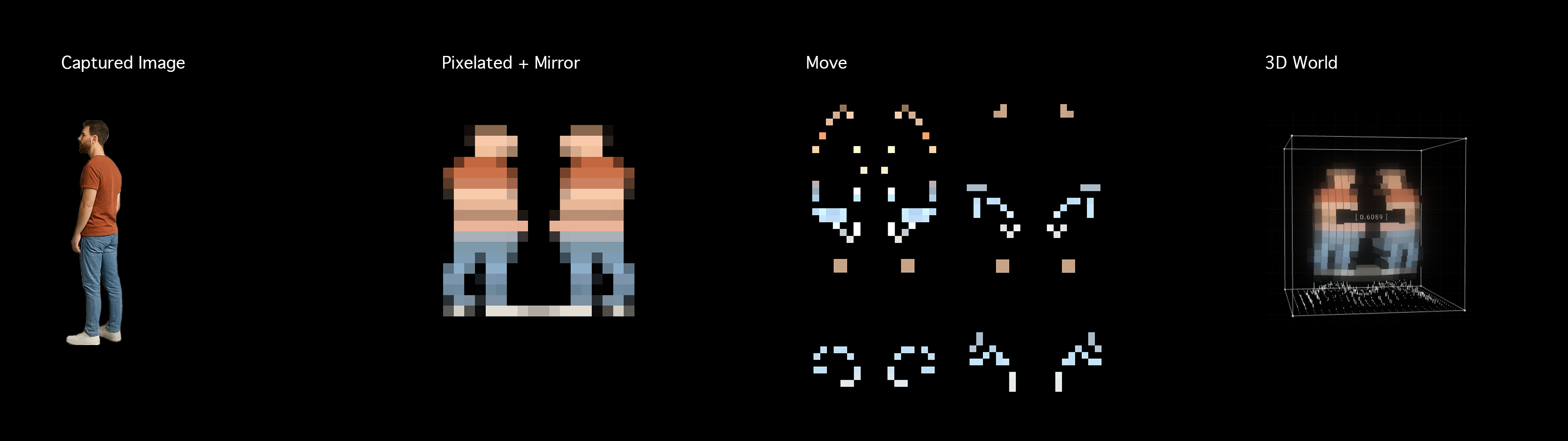 Using surveillance devices, the work captures the presence of participants and transforms them into pixels inside a virtual environment. These figures move according to predefined logic, no longer driven by personal intention, but by the invisible architecture of code.