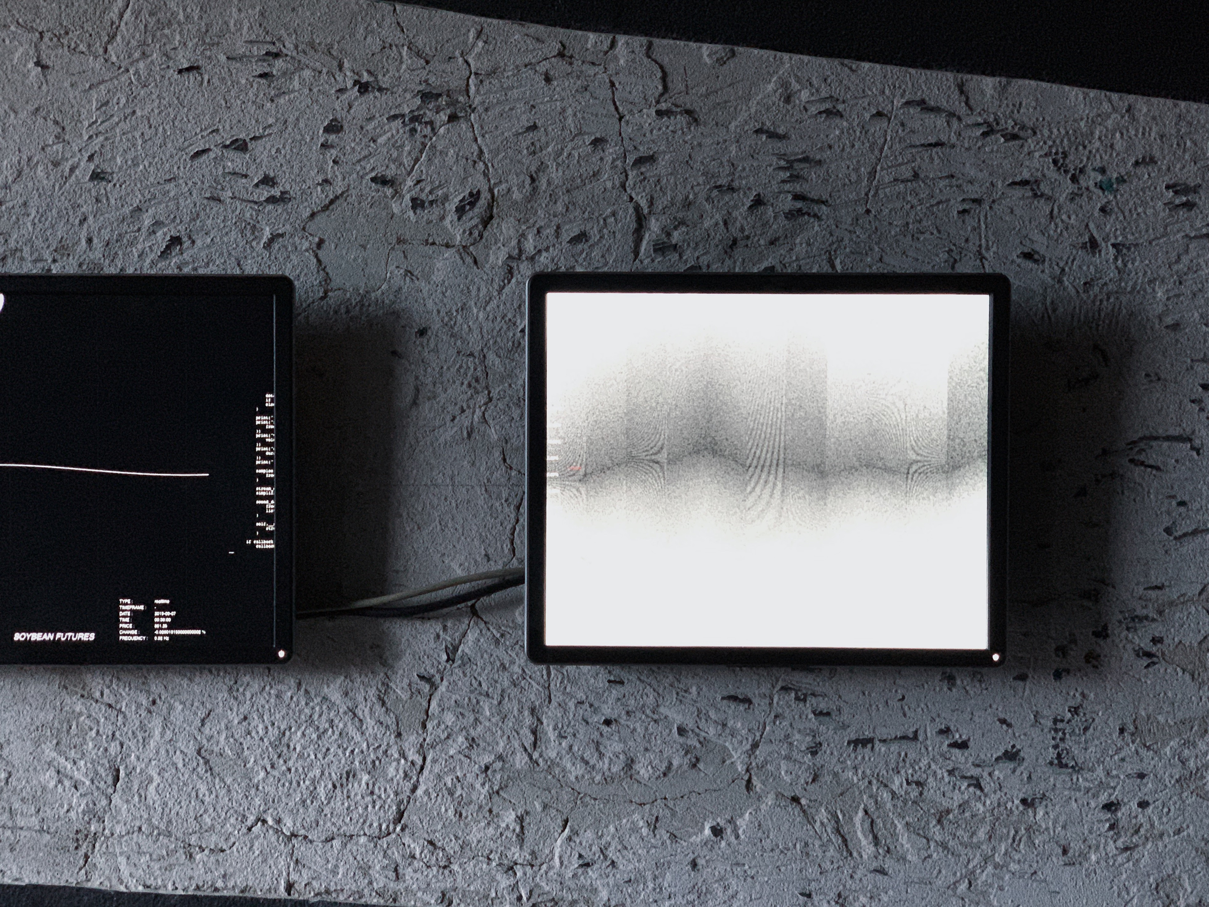 The soybean (sometimes called the “great bean” in Chinese) is the main material for all kinds of bean food products, in particular tofu. In the East it is an important foodstuff and source of protein, as well as a cultural symbol. The effects of globalization have made soybean supply and demand a bargaining chip or a weapon in a global trade war. The installation Soybean Futures converts global soybean futures index data into sound waves; the speaker’s vibrations shake the tofu on the installation, suggesting how these up-and-down fluctuations affect human life. The installation’s production process: research and make tofu suitable for the vibration effect; extract global soybean market data, organize and analyze this material and convert it into sound waves. Changes in the global soybean futures index determine the extent of the vibration -- the greater the fluctuation in the market, the more visible the vibration of tofu, and vice versa.